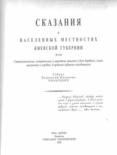 | Недавно знайшов в електронному варіанті цікаву книжку, в якій мається згадка про наше село. Книга була надрукована у друкарні Києво-Печерської Лаври у 1864 році*. Автор книги Похилевич Л.І. на титульній сторінці книги 2005р , рік перевидання книги.